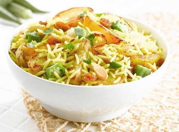 3. К этому времени рис должен уже свариться. Добавьте в него йогурт, розовую воду, шафрановое молоко, осторожно перемешайте его вилкой и оставьте в покое на 5 мин. Смажьте маслом дно сковороды или кастрюли, покройте его половиной риса и разровняйте. Сверху ровным слоем положите овощи, покройте их остатками риса и разровняйте. Накройте сковороду листом фольги так, чтобы она пропускала как можно меньше пара. Нагрейте духовку до 140° С и запекайте рис при этой температуре в течение 15-20 мин.