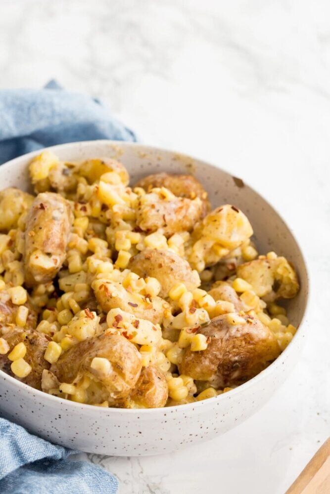 Смешать в миске картофель и кукурузу, добавить соус и перемешать.