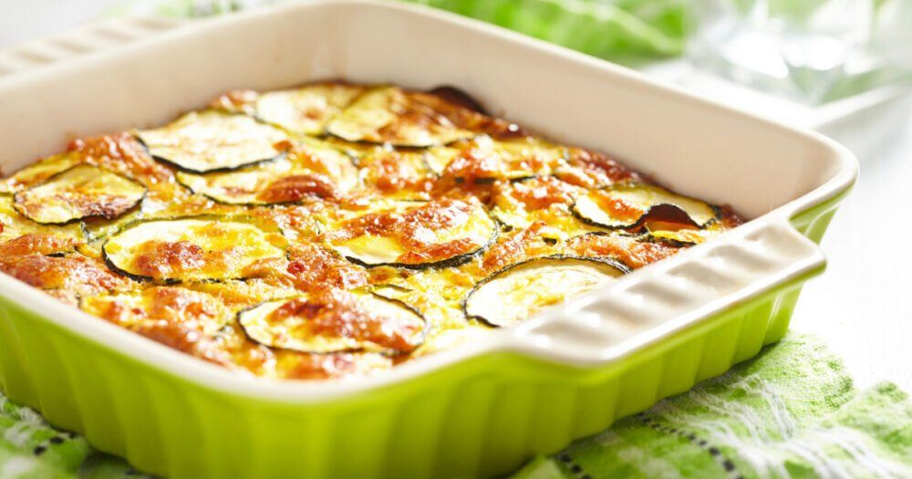 Форму для запекания смазать маслом и выложить слой нарезанного тонкими пластинами кабачка.