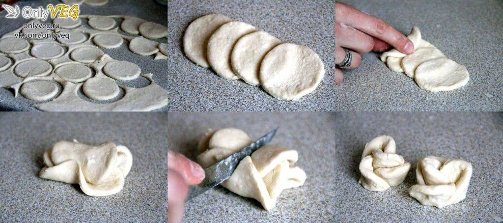 6. Затем берем берем 4 кружка и выкладываем их на стол внахлест. Можно брать разное количество кругов, поэксперименируйте, какое Вам больше нравится: 3 — будут тоненькие и маленькие булочки, при 5-7 — более пышные.