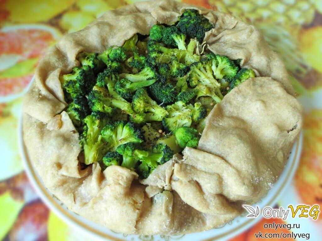 6. Далее тесто раскатываем в круг толщиной 3мм. В центр выкладываем подстывшие картофель и морковь, сверху выкладываем разобранные на мелкие соцветия брокколи.