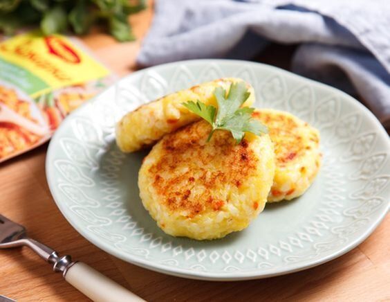 Охлажденный рис (он должен быть клейким) смешать с сыром, орехами, зеленью, солью и специями. Хорошо перемешать, добавить ложку муки, если нужно. Вылепить котлетки. Обвалять в муке и обжарить с двух сторон на масле.