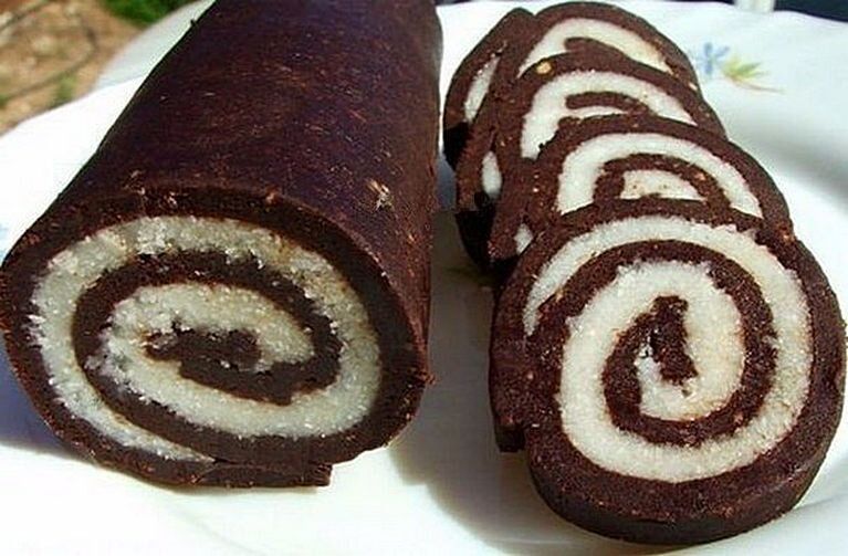 5. Массу из печенья раскатать на пищевой пленке в прямоугольный не слишком толстый пласт (примерно, 0,5см), сверху распределить кокосовую массу, свернуть рулетом и убрать в морозилку минут на 30-40.