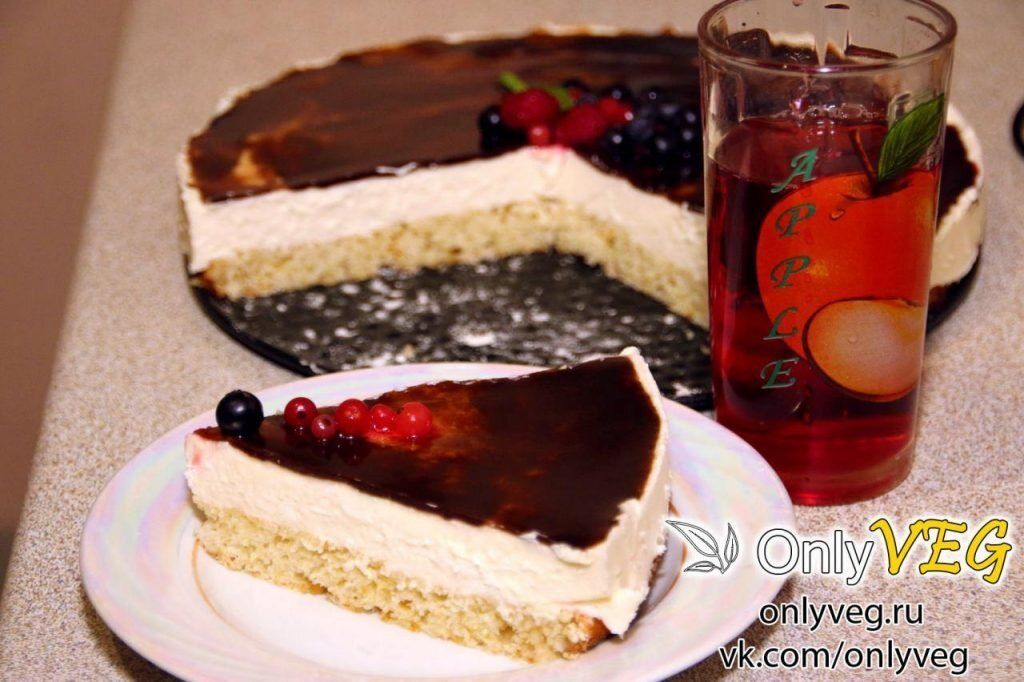 - Для глазури ставим на огонь кастрюлю с водой, добавляем агар, затем сахар и кэроб, все перемешиваем. Доводим до кипения и снимаем с огня. Даем массе немного остыть и затем заливаем торт. Кстати можно использовать и любую Вашу любимую глазурь для покрытия. Снова отправляем в холодильник. Через пару часов торт уже можно подавать.