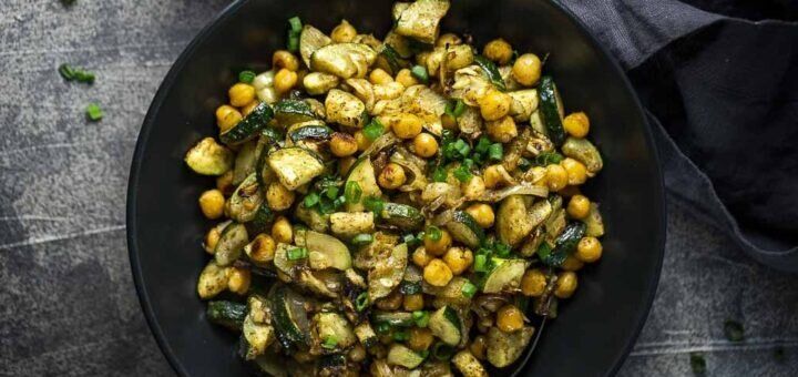 Запеченный со специями нут выходит очень вкусным и хорошо сочетается с запеченными кабачками. Попробуйте приготовить этот замечательных теплый салат из цукини с нутом на обед!