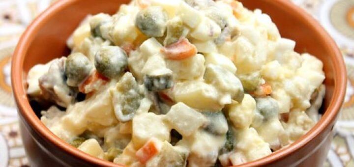 • 200 г картофеля • 100 г морковки • 100 г солёных огурцов • 1 маленькое яблоко • 50 г свежих огурцов • 100 мл сметаны • 4 ст. л. консервированного зелёного горошка •...