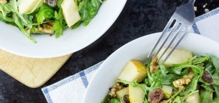 Залог питательного салата — зелень, фрукты и орехи. Все обязательные составные части этой прекрасной формулы вы найдете в салате из рукколы, груши и грецкого ореха.